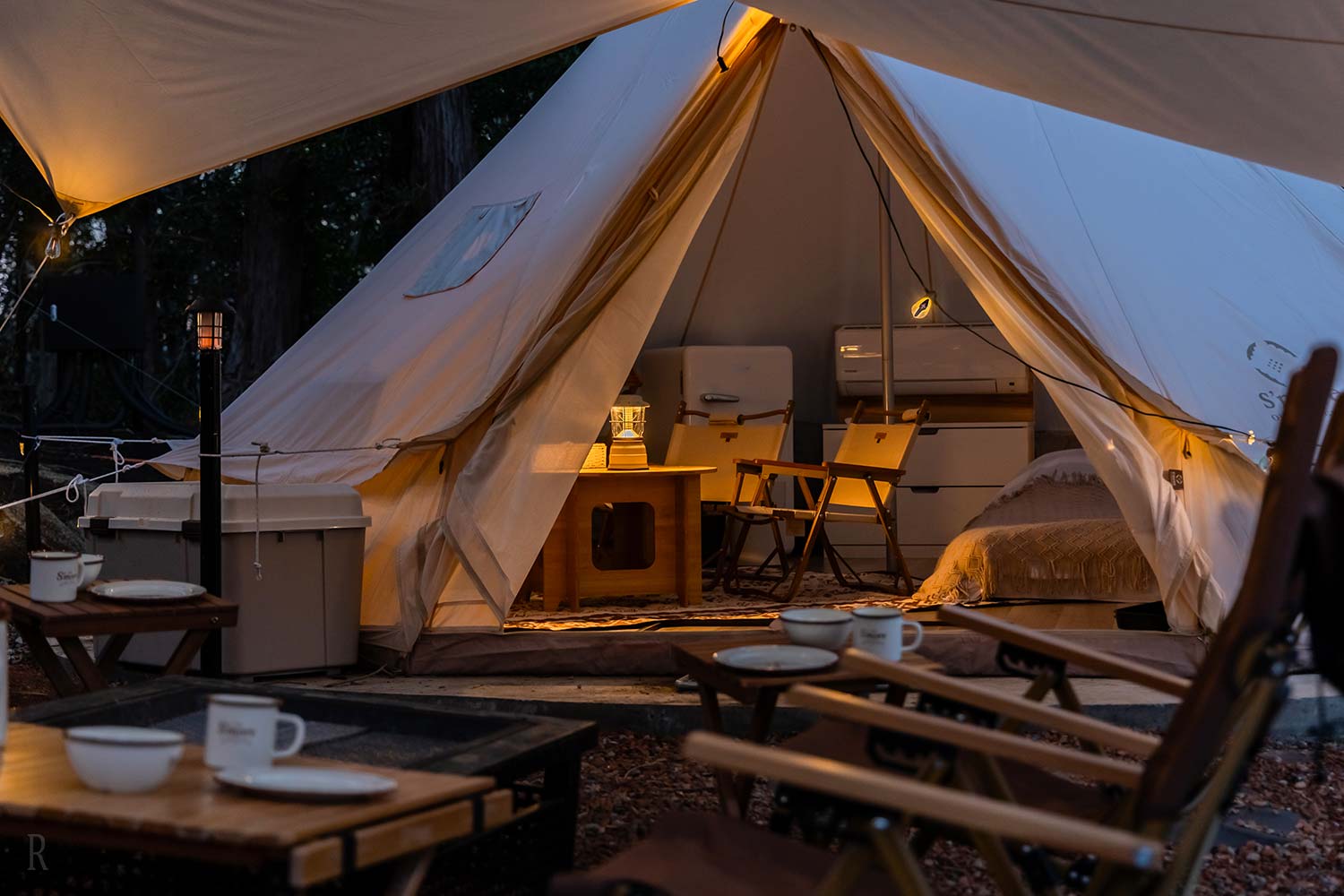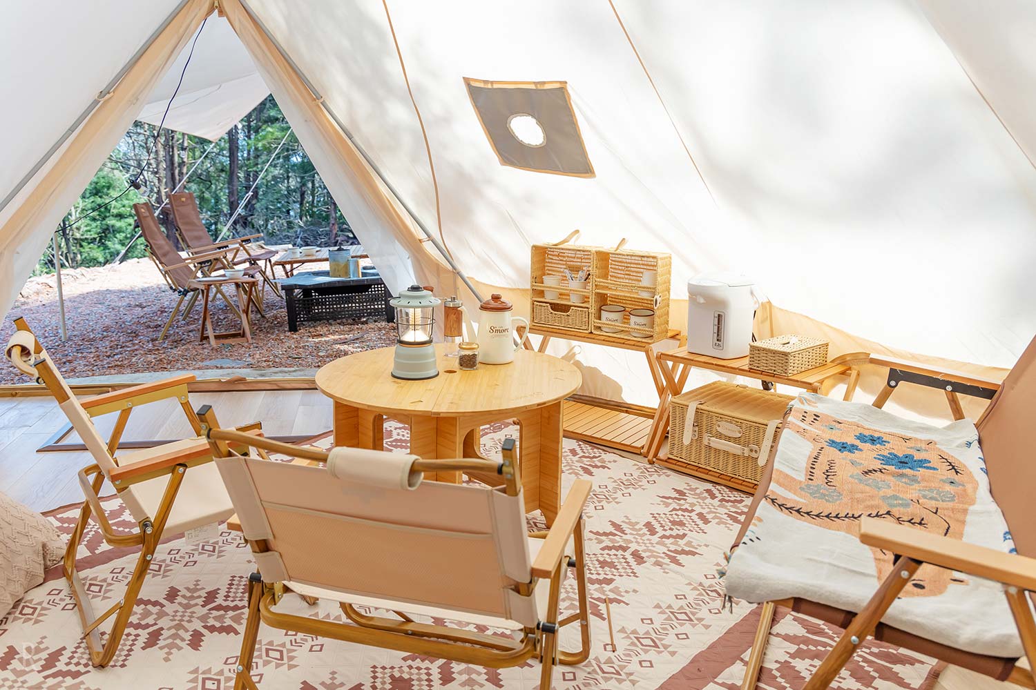 草木の揺れる自然いっぱいの中に配置された、ブランド自慢の大型ベルテント。 ぬくもりあるおしゃれなインテリアに囲まれ、まるで自宅のリビングのように寛げます。